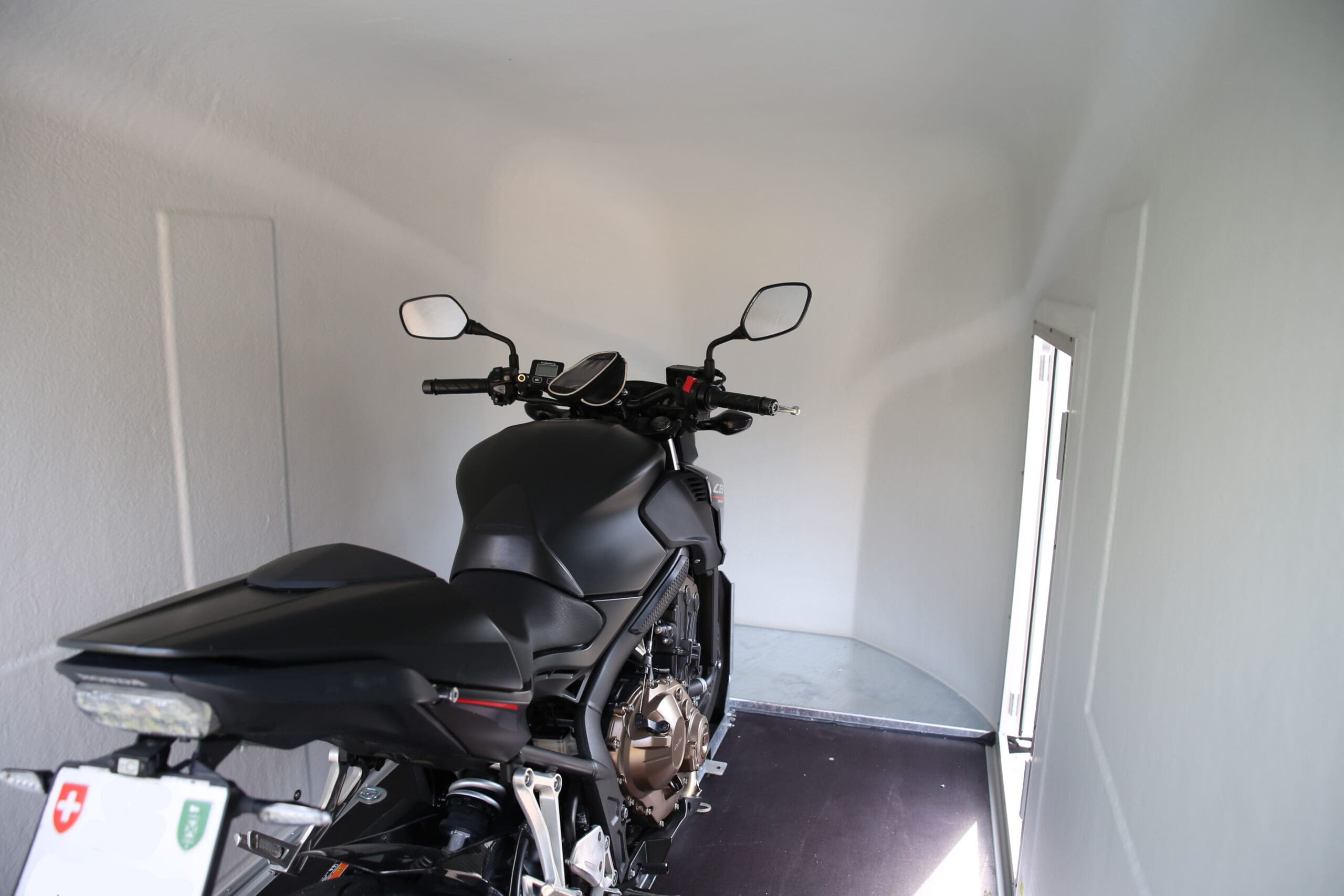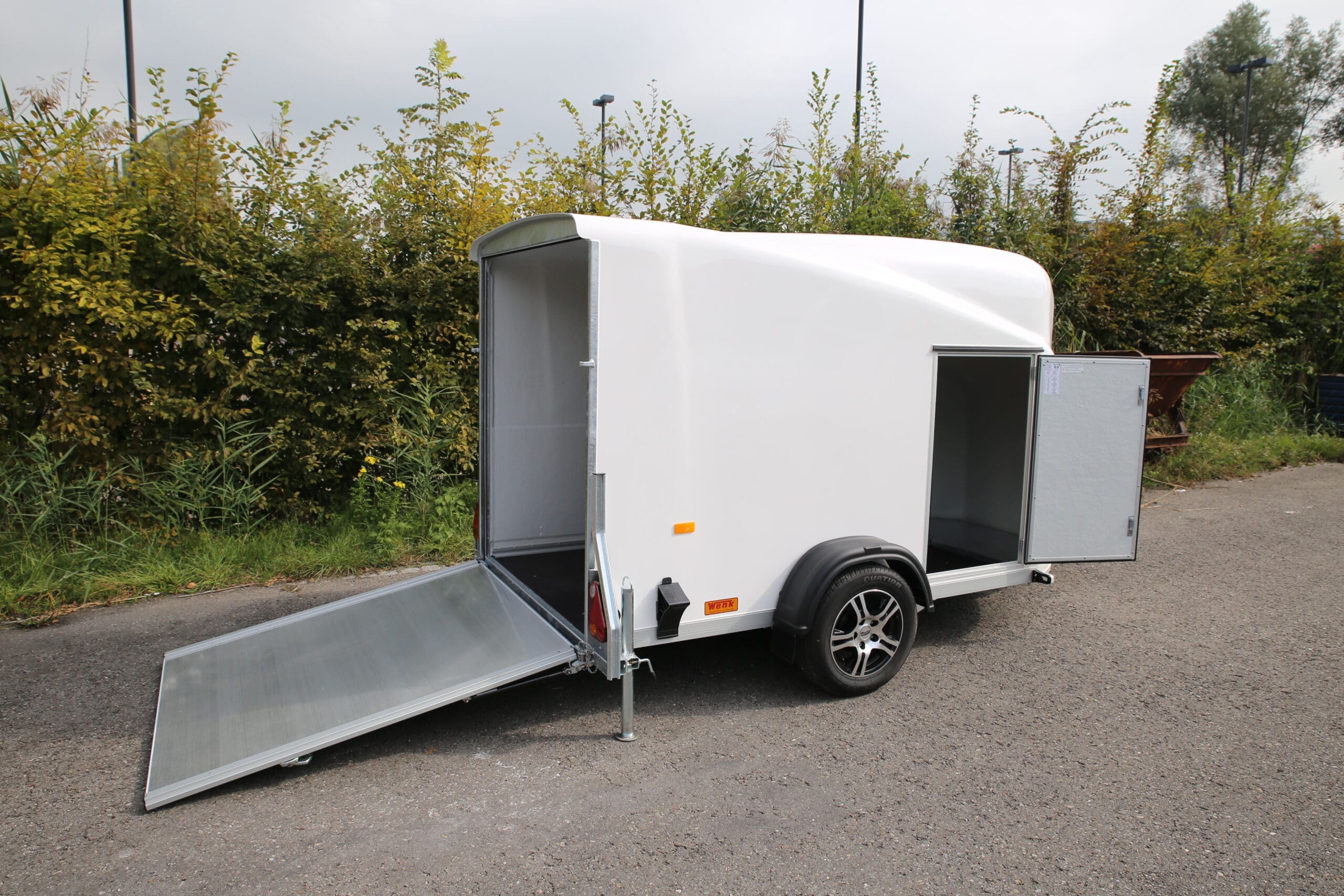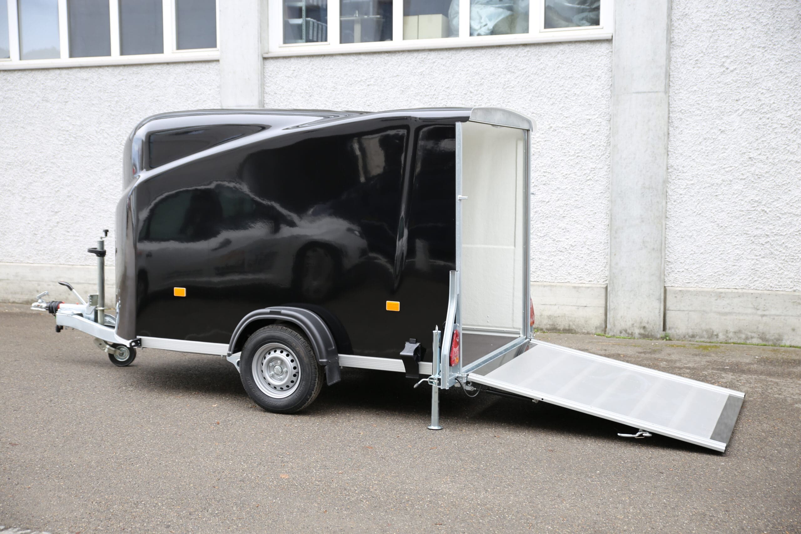 Hinten mit einer Kombirampe, die als Türe auf geschwenkt, oder als Rampe abgeklappt werden kann. Durchfahrtshöhe beim Heckportal 1560 mm. 2 Schiebestützen hinten montiert. Innenbeleuchtung. Kugelkupplung mit Sicherheitsanzeige, Auflaufbremse und Rückfahrautomatik. Einzelradaufhängung mit Schraubenfedern und Radstossdämpfern. Dadurch ergibt sich eine tiefe Ladehöhe für ein leichtes Beladen mit Paletten-Hubwagen, Motorrädern, Rasentraktoren, Schneefräsen und Motorrädern. Der ideale Ferienanhänger für die Familie, auch für Fahrräder, Motorräder usw.