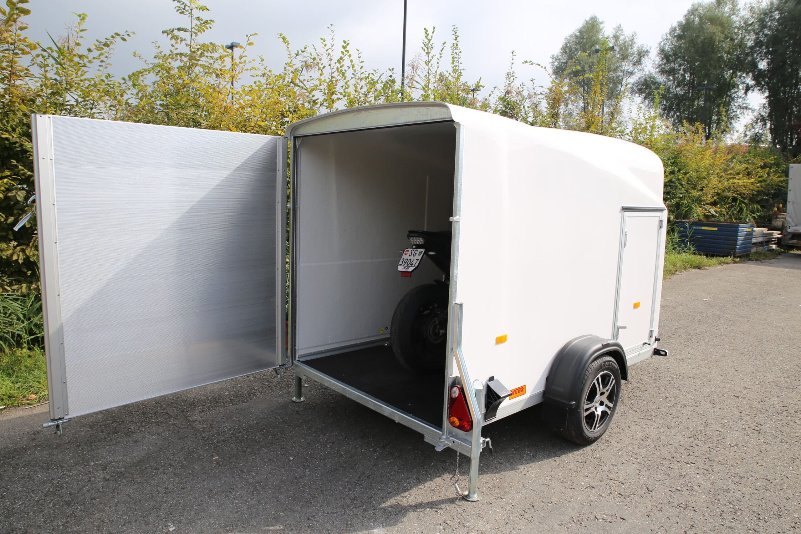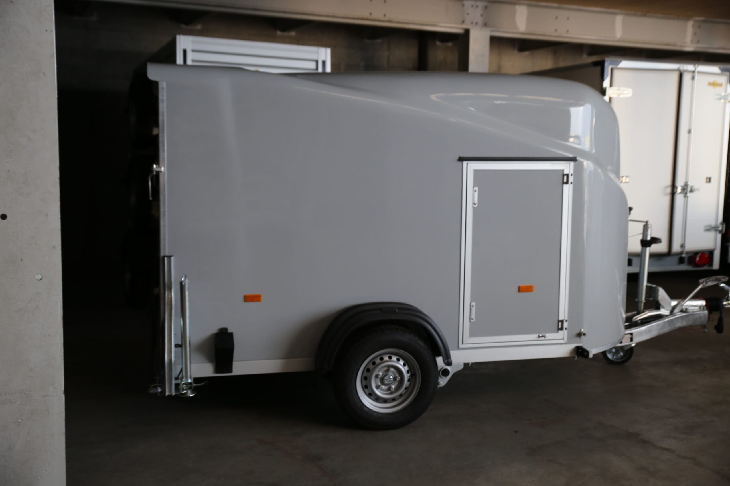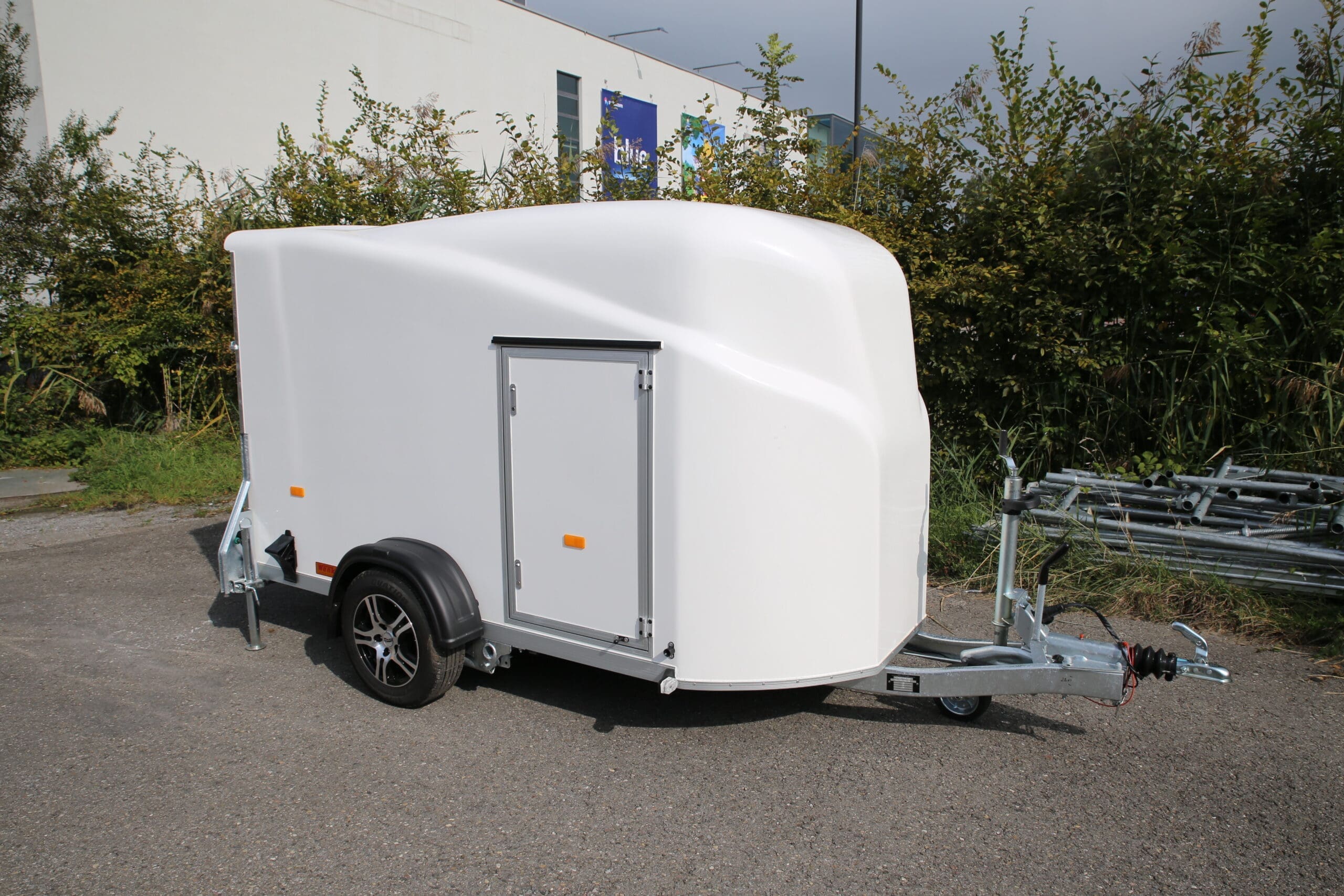 Einachsiger Kofferanhänger mit aerodynamischem Aufbau aus GFK. Standardfarbe Weiss. Als Option in Schwarz, anthrazit und rot lieferbar. Chassis aus Stahl, im Bad feuerverzinkt.