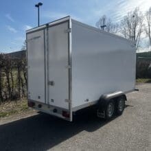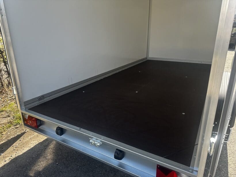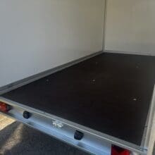 Kofferanhänger mit Kugelkupplung, Auflaufbremse und Rückfahrautomatik.