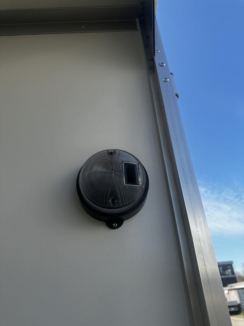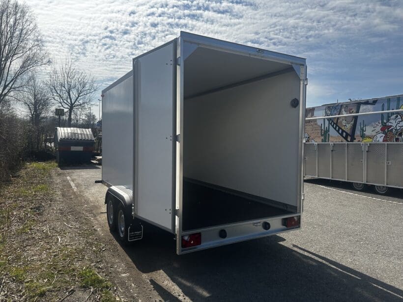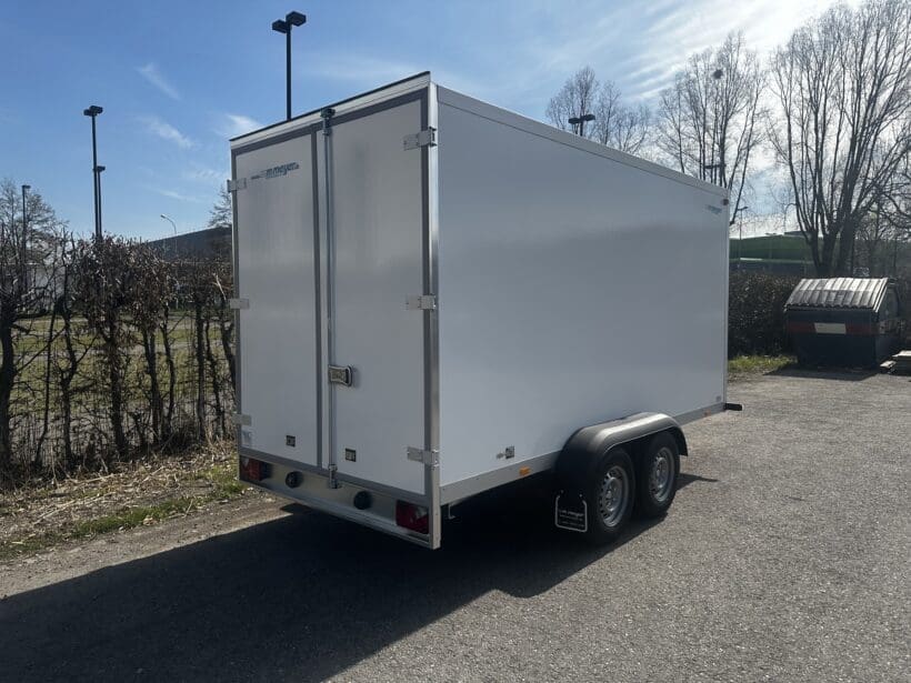 Wände, Türen und Dach aus isolierten, weissen Sandwichplatten. Wände und Türen 18 mm dick, Dach 25 mm dick. Senkrechte Verstärkungen in den Seitenwänden. Alle Sandwichplatten aus einem Stück mit glatter Oberfläche. Ideal für Beschriftungen. Kasten verrottungsfest. Hecktüren mit abschliessbarem Drehstangenverschluss verzinkt, Hecktüren 240°-270° umschlagbar. 1 Rangiergriff, 2 Türfeststeller und 1 Innenleuchte mit separatem Schalter.