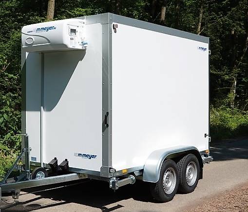 Tiefkühlanhänger mit 100 mm Isolation. Kugelkupplung, Auflaufbremse mit Rückfahrautomatik, Achsen und V-Deichselrahmen verzinkt. Gummifederachsen mit wartungsfreier Federung.