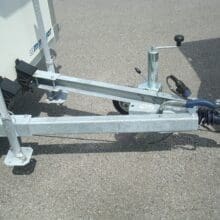 Kugelkupplung, Auflaufbremse mit Rückfahrautomatik, Achse und V-Deichselrahmen verzinkt. Gummifederachse mit wartungsfreier Federung.