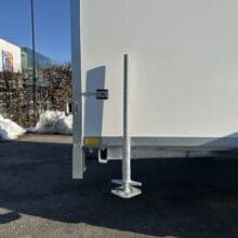 Automatik-Stützrad mit Halterung, innen an der V-Deichsel mit zusätzlicher Abstützung montiert.