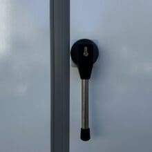 Treibriegelverschluss für linken Hecktürflügel (Griff zentral mittig), Rammschutz innen aus weissem GFK, (Höhe: 250 mm), Innenbeleuchtung 230 V mit Bewegungsmelder.