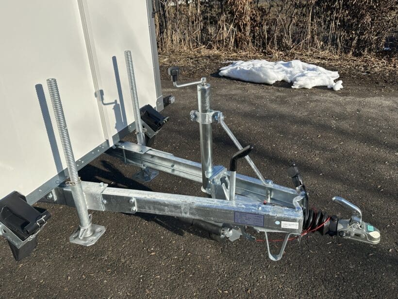 Kugelkupplung, Auflaufbremse mit Rückfahrautomatik, Achsen und V-Deichselrahmen verzinkt. Gummifederachsen mit wartungsfreier Federung.