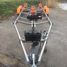 Die Windenstand und die Bugstütze können einfach in Länge und Höhe verstellt werden. Die Kiel- und Kim-Rollen, auf denen sich Ihr Boot befindet, können auch in der Höhe und / oder in Längsrichtung bewegt werden. Die automatisch gebremste Luxus-Sicherheitshandwinde ist serienmäßig mit einem soliden Windengurt ausgestattet.