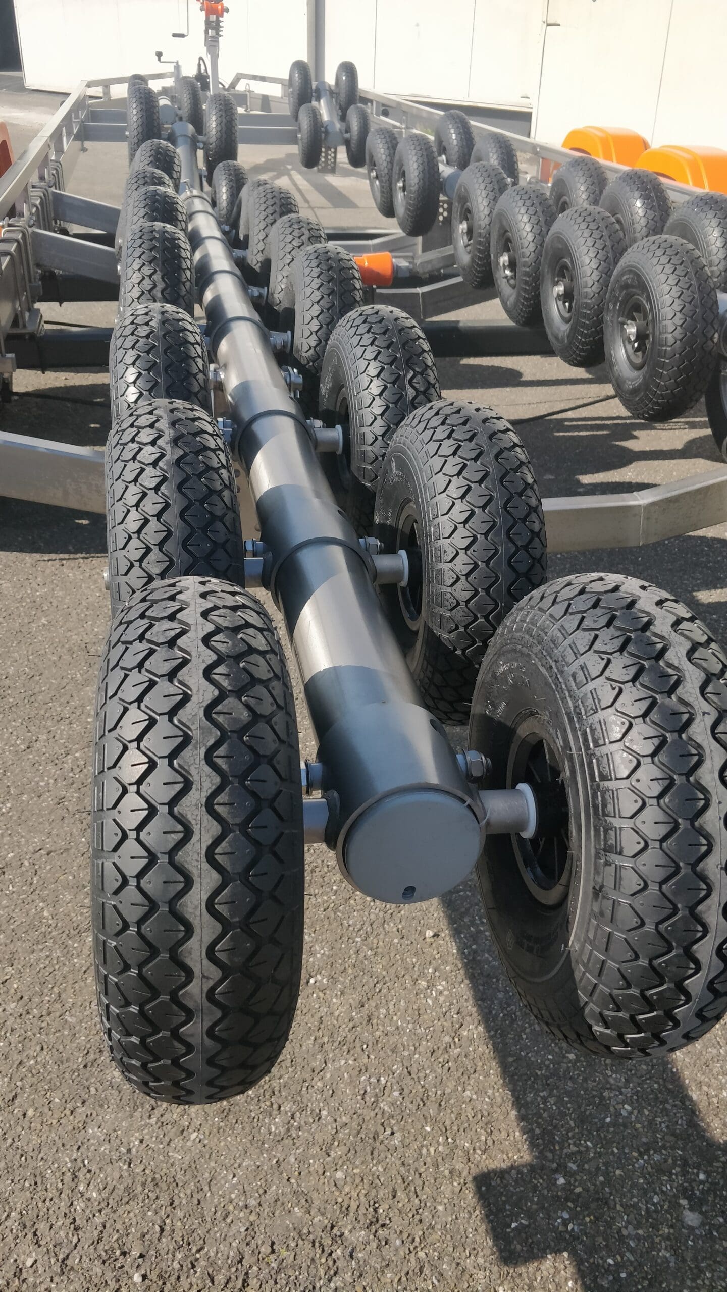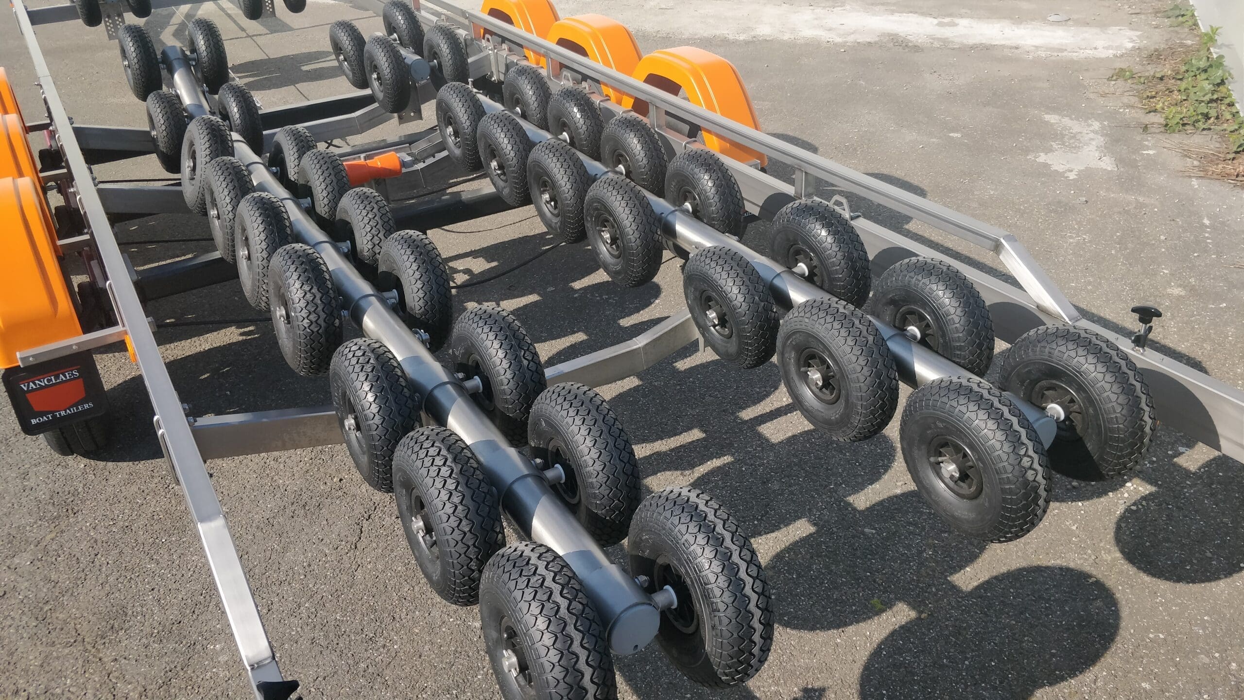 Die Vanclaes GYRO-Rollen sind von Polyurethanschaum und ab dem 2750 kg schweren Anhänger ist der Anhänger serienmäßig mit Nylonreifen ausgestattet. Alle GYRO-Rollen sind 100% kratz- und streifenfrei.