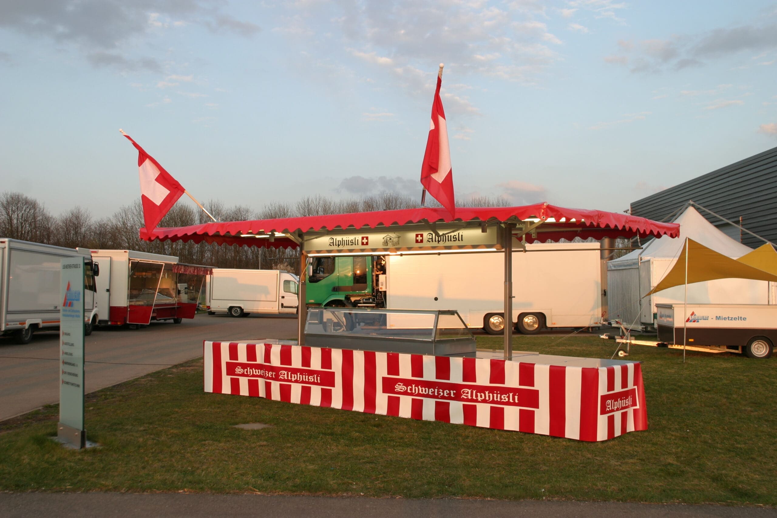 Verkaufsanhänger aufgestellt, ohne Rückwand, Einplanung • Dachplane und Tischumhang aus PVC rot.