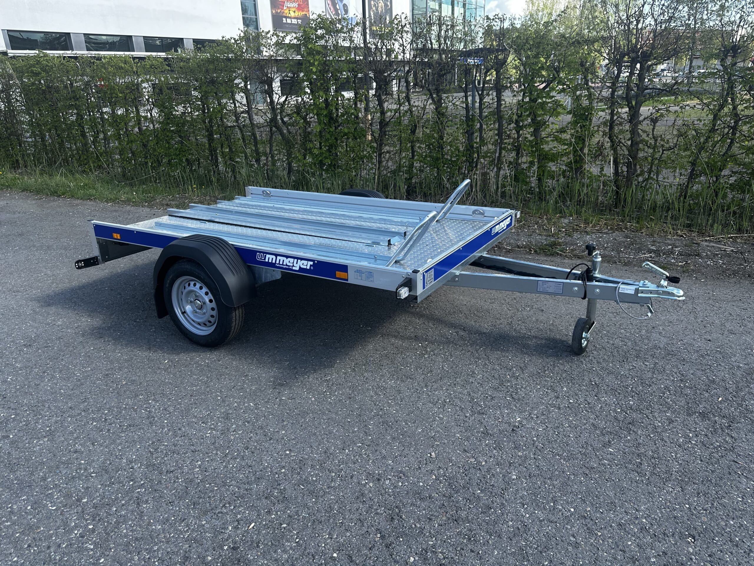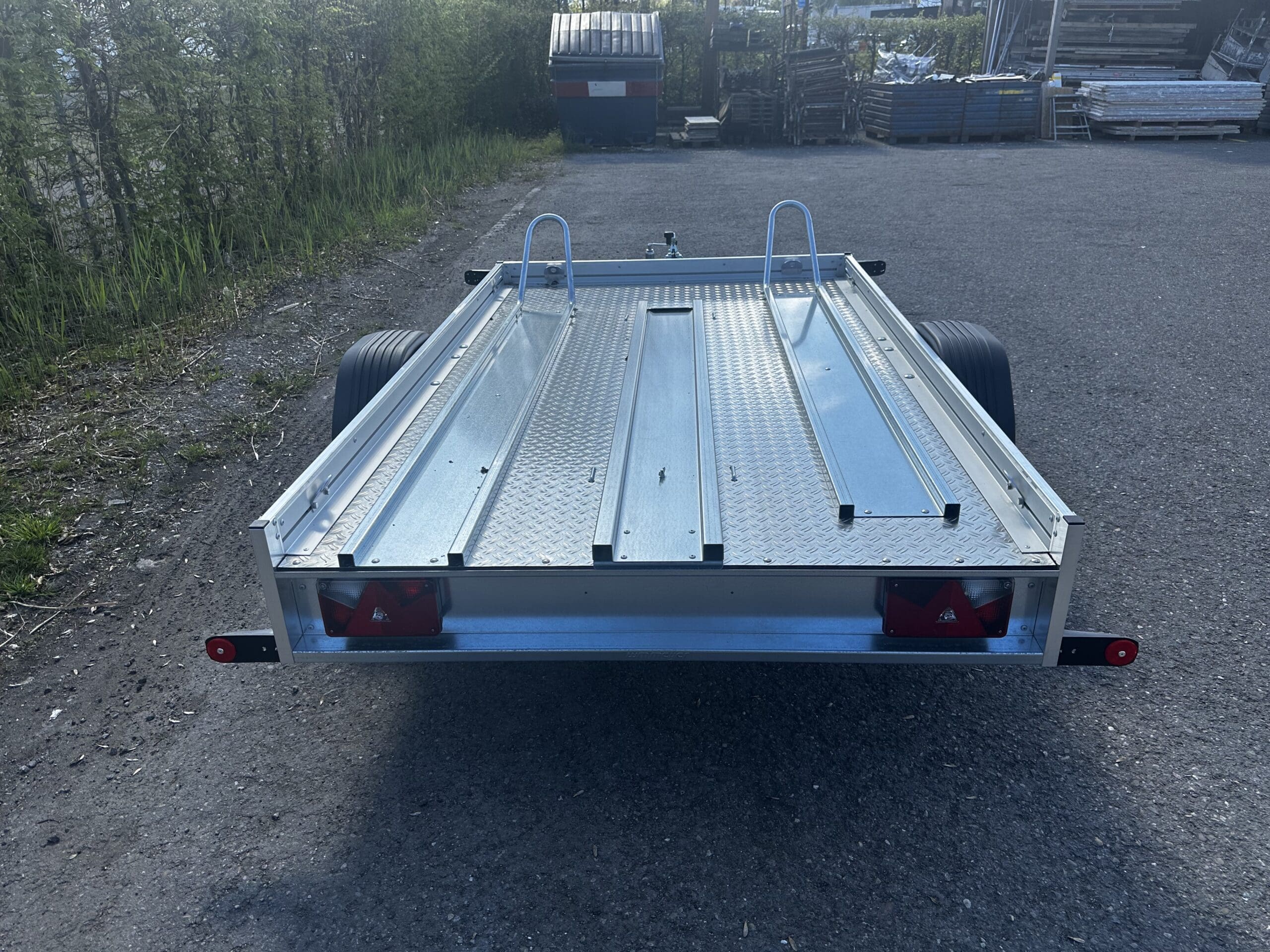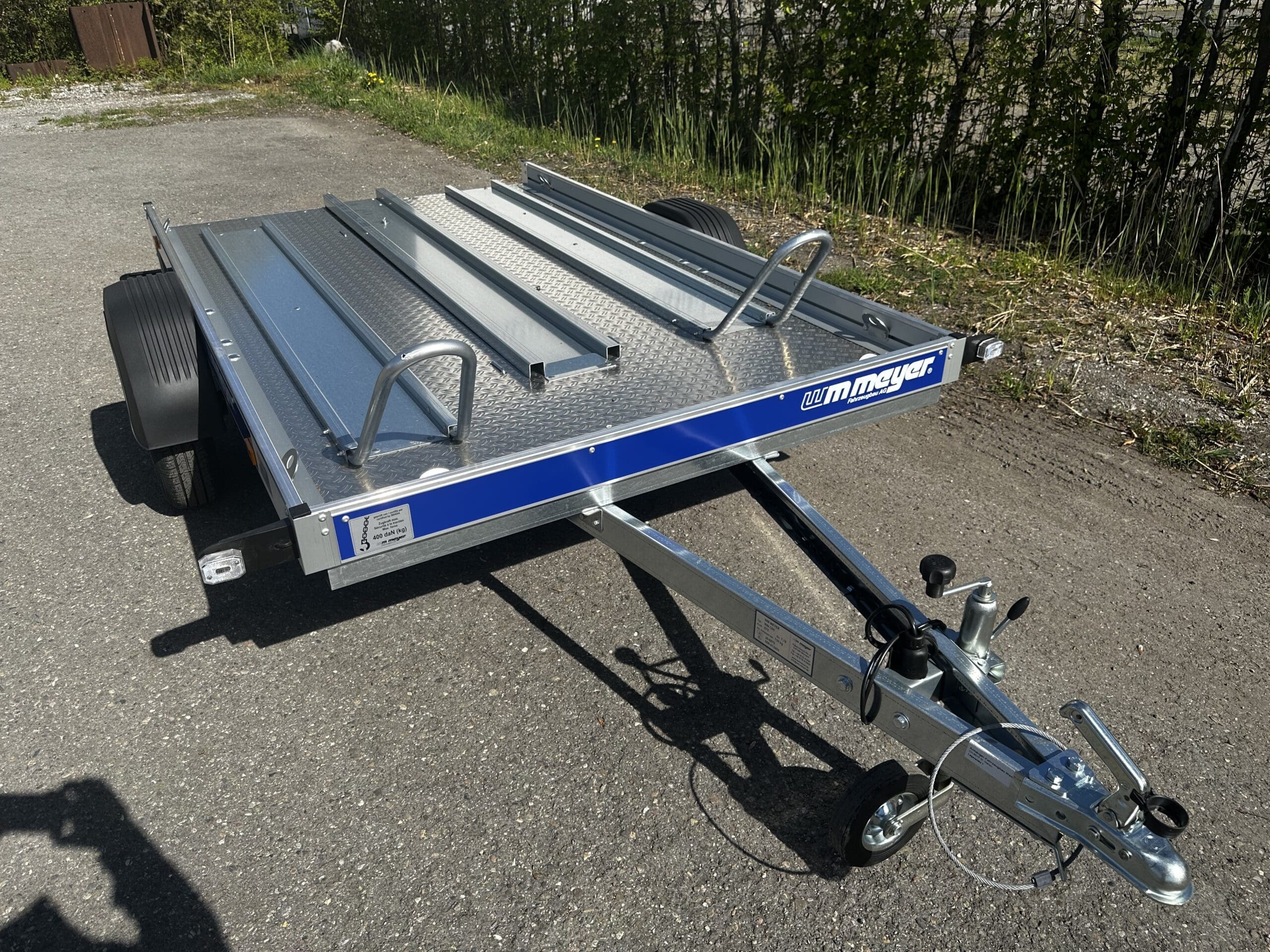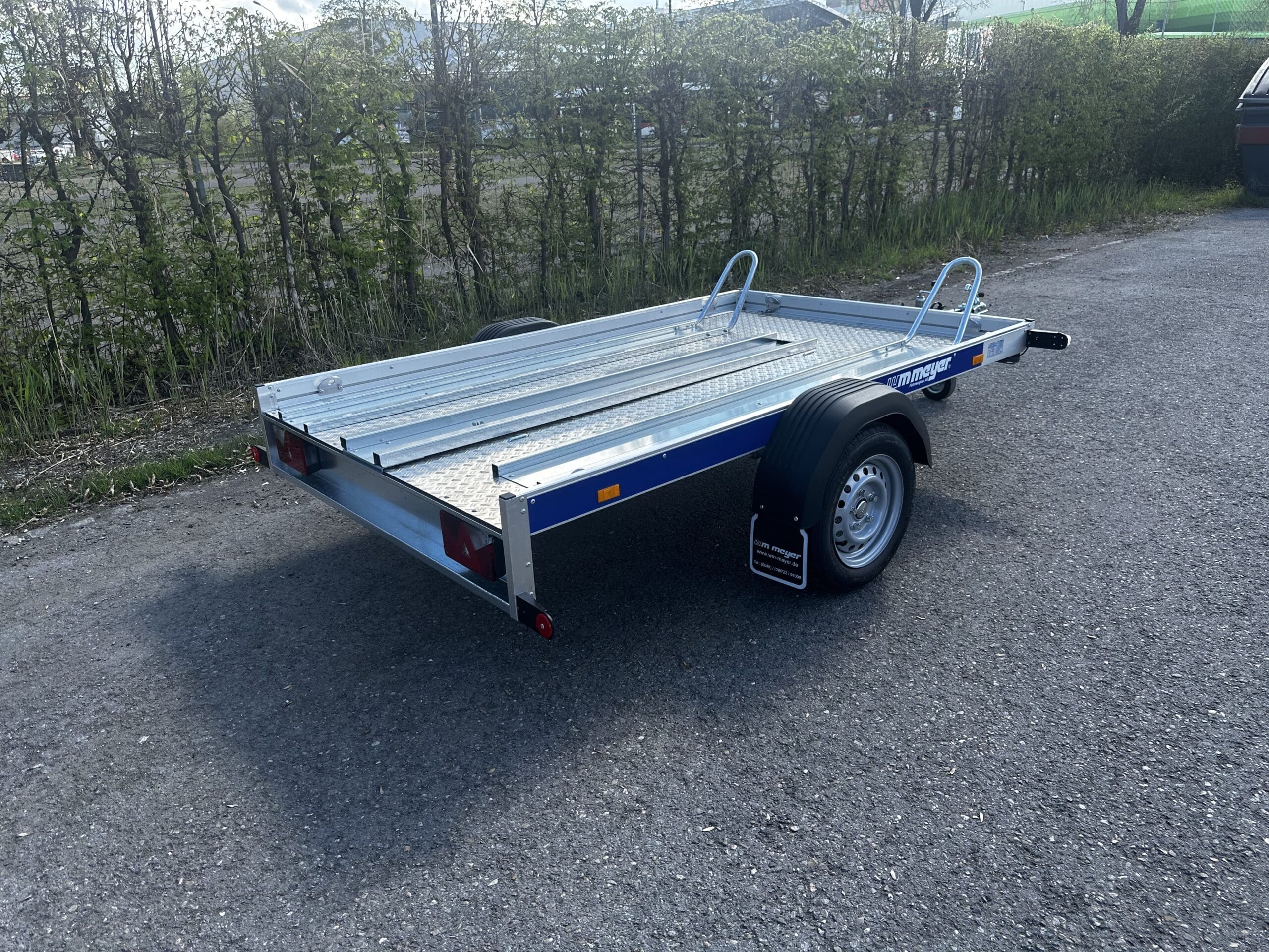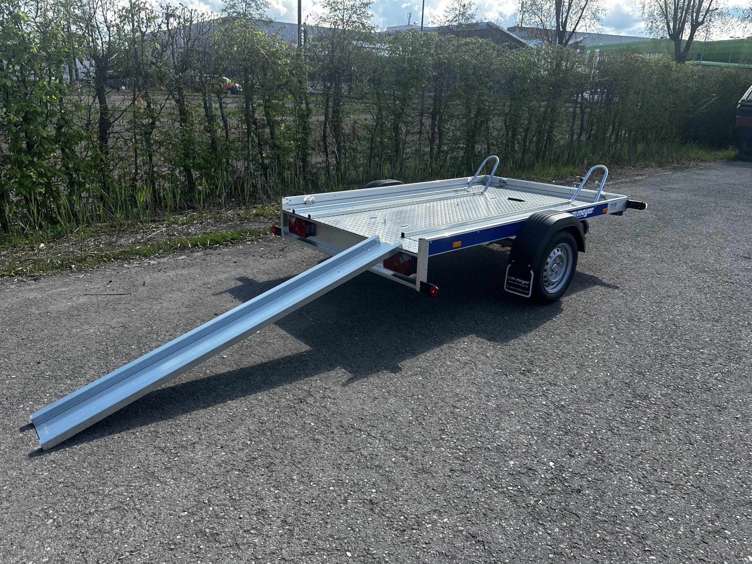 Kugelkupplung mit Sicherheitsanzeige, Chassis- Deichsel- u. V-Zugdeichsel aus verzinktem Stahl. Durchgehender Boden aus einer Siebdruckplatte, mit Aluriffelblech belegt. 2 Standschienen mit Bügel, oder wahlweise 2 Motorradwippen. 1 Auffahrschiene. Beleuchtung 12 Volt geschützt im Unterfahrschutz eingebaut. Stecker 13-pol. Bordwände seitlich und vorne aus Alu, Höhe 100 mm. 6 verschiebbare Binderinge aus Edelstahl. Optional mit aufsteckbaren Alubordwänden oder mit Blachenverdeck lieferbar.