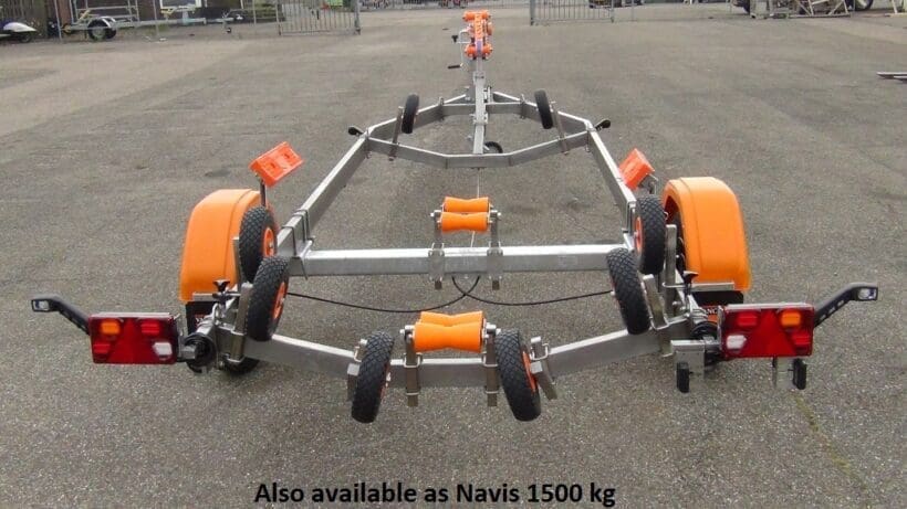 Alle Vanclaes Navis-Modelle sind standardmäßig mit einer Zentriervorrichtung mit kratz- und streifenfreien Polyurethanschaumrädern ausgestattet. Für den sicheren Transport sind am Heck des Anhängers zwei einstellbare Spindelstützen angebracht.