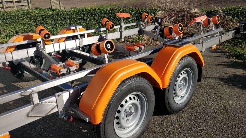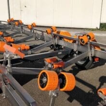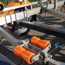 Alle Vanclaes Navis-Modelle sind standardmäßig mit einer Zentriervorrichtung mit kratz- und streifenfreien Polyurethanschaumrädern ausgestattet. Für den sicheren Transport sind am Heck des Anhängers zwei einstellbare Spindelstützen angebracht.