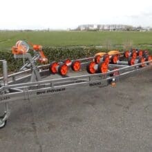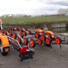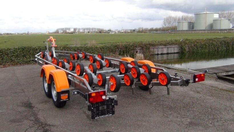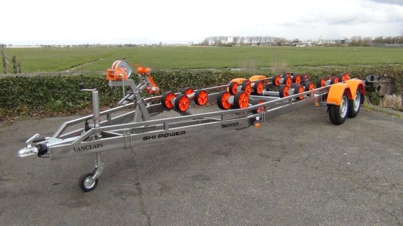 De Vanclaes Ski Power gebremste Bootsanhänger ist für Wasserski- en Wakeboardboote mit Gelenkwelle und möglicherweise zusätzlichen Flossen.