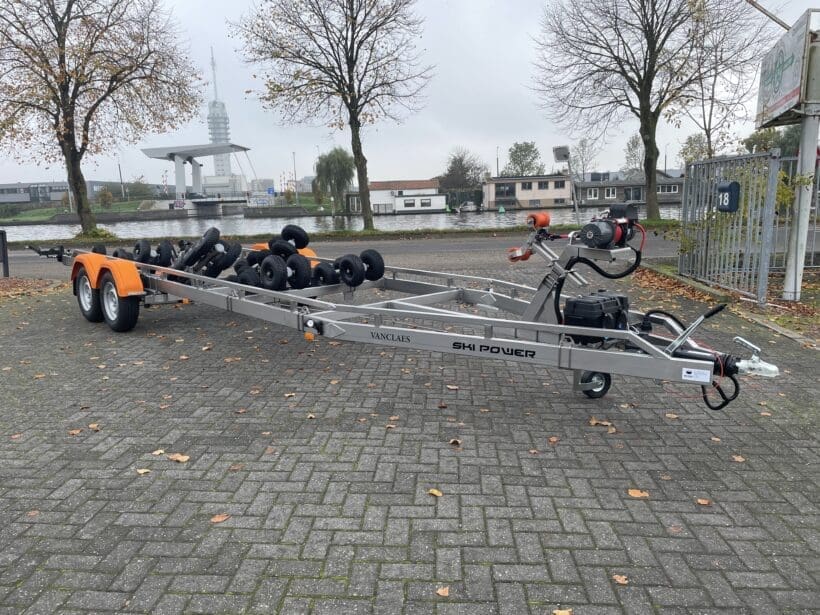 De Vanclaes Ski Power gebremste Bootsanhänger ist für Wasserski- en Wakeboardboote mit Gelenkwelle und möglicherweise zusätzlichen Flossen.
