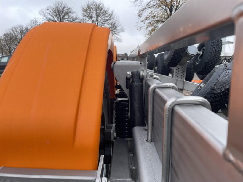 Die feuerverzinkte und anschließend anthrazit pulverbeschichtete gebremste Achslinie stammt von der deutschen Topmarke WAP und ist mit wasserfesten Edelstahl-Kompaktlagern ausgestattet. Wenn Sie sich für die Option Scheibenbremsen entscheiden, werden standardmäßig 100% wasserdichte Öllager geliefert. Darüber hinaus ist jeder gebremste Anhänger standardmäßig mit Stoßdämpfern an jeder Achslinie ausgestattet. Die Auflaufbremse ist ebenfalls serienmäßig, nach dem Feuerverzinken, anthrazit pulverbeschichtet.