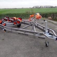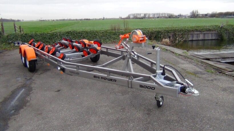 De Vanclaes Ski Power gebremste Bootsanhänger ist für Wasserski- en Wakeboardboote mit Gelenkwelle und möglicherweise zusätzlichen Flossen.