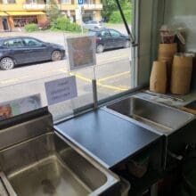 - Spuckschutz aus Glas. Montiert auf der Verkaufstheke.